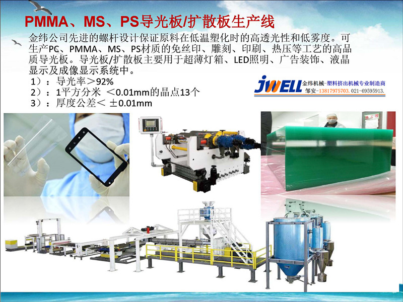 金纬公司先进的螺杆设计保证原料在低温塑化时的高透光性和低雾度。可生产PC、PMMA、MS、PS材质的免丝印、雕刻、印刷、热压等工艺的高品质导光板。