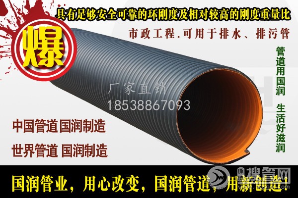 采用了U型钢带复合PE材料,使管材在不增加成本的前提下大幅度提高环刚度,同等重量情况下比缠绕管、克拉管强度大幅度提高。可解决重载等一系列问题,大口径管材优势更加明显,生产管材口径从DN300mm到DN3000mm,环刚度都保持在8KN/m2以上,比水泥管和其它塑料管重量更轻、强度更高