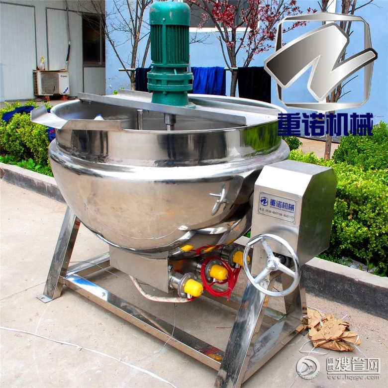 不锈钢夹层锅 高温蒸煮锅 熬粥夹层锅的出料方式是在夹层锅底部开一个4.5-6.5mm大小的口进行出料所以适合比较稀薄的汤类、八宝粥、肉脂等食品。可倾式夹层锅的出料方式是转动手轮通过蜗轮蜗杆带动夹层锅倾斜倒出物料,锅体可旋转90度,方便客户倾倒物料。适用的食品范围广泛。相比立式夹层锅多了倾斜这一工作步骤,在采购的时候,客户可根据自己的实际需要进行选择。 重诺公司的设备是厂家直销,行业价格非常透明,有些客户都会选择从经销商那里购买,因为经销商那里价格便宜非常之多。为什么我们厂家都卖不到的价格,夹层锅经销商是怎么做到的呢很简单,他们进货的厂家可能是以更低的价格卖给经销商的,外观差不多,但板材材质跟设备及设计理念,都是在用肉眼看不到的地方下了功夫细节如:搅拌机、安全阀、疏水阀等配件上也是偷工减料。重诺机械夹层锅板材全部是304不锈钢的,厚度达到3mm。重量都有别家设备的2倍,内胆采用的是东科的,因为内胆是一次旋压成型的,所以在采购时就比别的厂家多定了一个厚,产品细节方面可想而知。